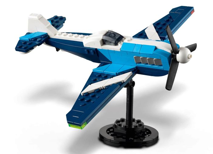 Superfast adventures in the sky await boys and girls aged 7 plus with the LEGO® Creator 3in1 Aircraft: Race Plane (31160) toy playset. The plane model has a rotating propeller at the front, moving wheels so it can travel on the ground, and a brick-built stand for display.