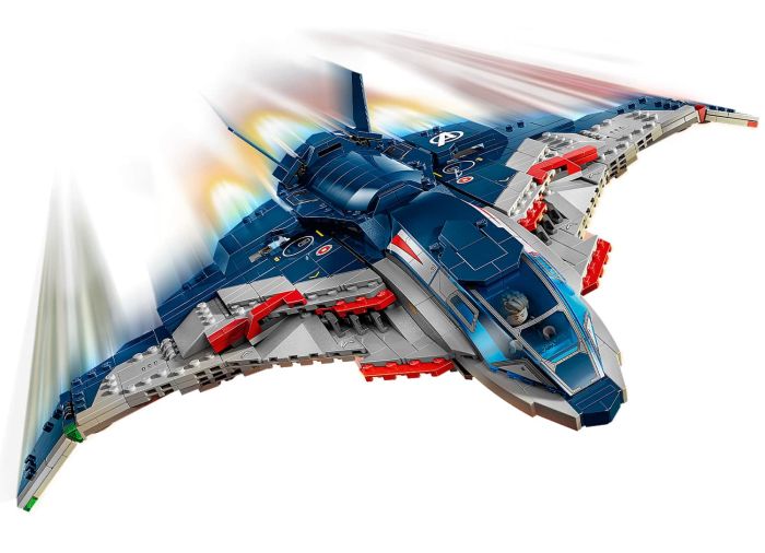 - Avengers Quinjet – The aircraft has an opening cockpit, 2 stud shooters at the front, storage for weapons and an opening rear door so kids can drive the motorcycle in and out