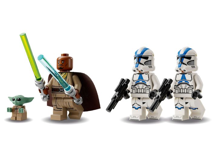 - 3 LEGO® Star Wars™ minifigures plus Grogu – Kelleran Beq with blue andgreen lightsabers, and 2 501st Clone Troopers, each with blasters, plus a Grogu LEGO figure