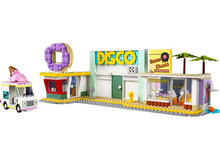 - Build scenes from the video – LEGO® brick versions of the disco, record store and donut store, each packed with authentic details, plus the ice-cream truck, basketball hoop and 2 palm trees