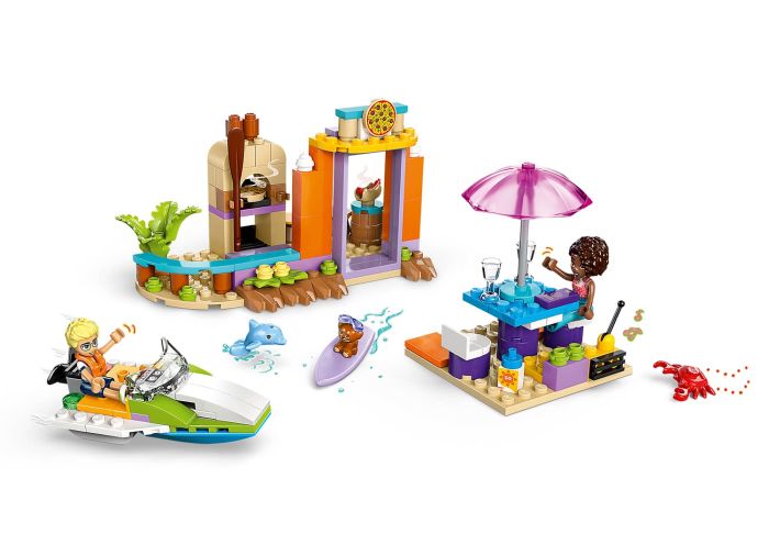 - Build, then rebuild – The set includes a beach scene with a seaplane, relaxation area and beach café hangout, which rebuilds into a new scene with a speedboat toy, an outdoor seating area and a pizza shop