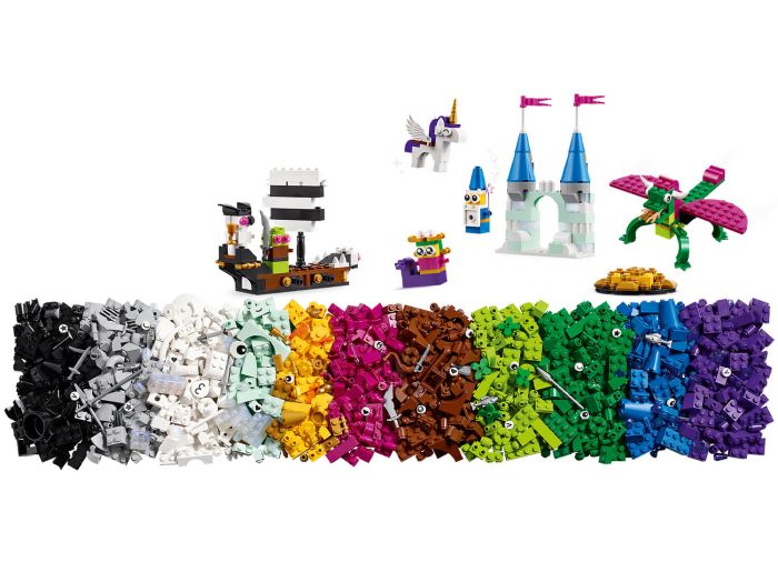 - A rainbow of colors – The set contains 1,800 brightly colored bricks, including gold, silver and opalescent elements, to build a dragon, castle, pirate ship, knights and many more inspiring toys
