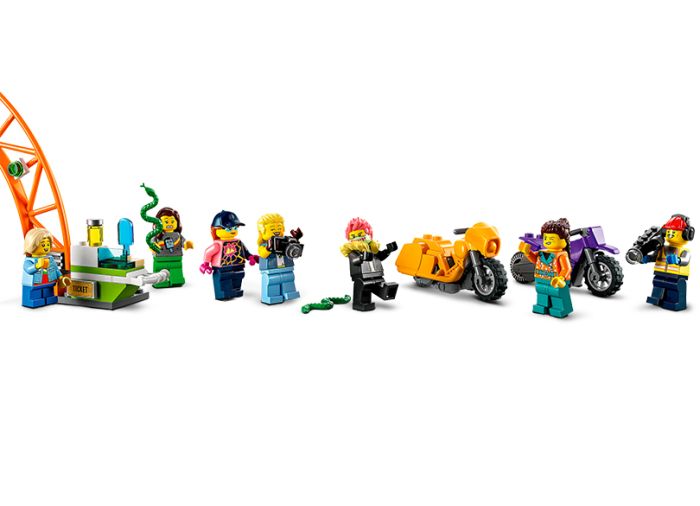 - What’s in the box? – This toy stunt arena includes an arched entrance, snake loop, fire loop, wall of flames, monster truck, vendor stall, spectator stand, 2 stunt motorbikes and 7 minifigures