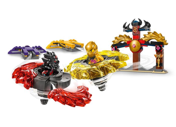 The Dragon Spinjitzu Battle Pack (71826) action toy playset lets boys and girls aged 6 and up play out amazing action from season 3 of the NINJAGO® Dragons Rising TV show. This small LEGO® action toy set features a battle arena temple, 2 minifigures of Arin and Ras and 2 dragon spinjitzu spinner toys for kids to place into launchers and fire into spinning battles against each other.