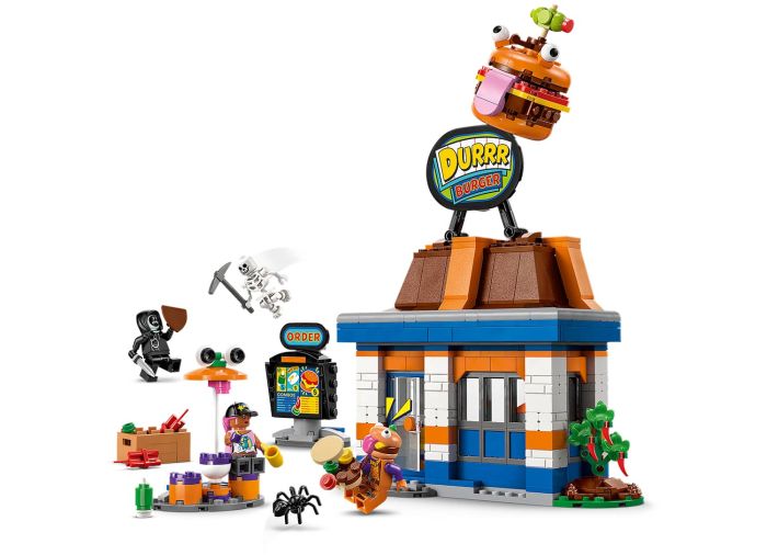 - Durrr Burger restaurant model – Feed imaginations with the LEGO® Fortnite® Durrr Burger Restaurant building set for kids aged 10 and up