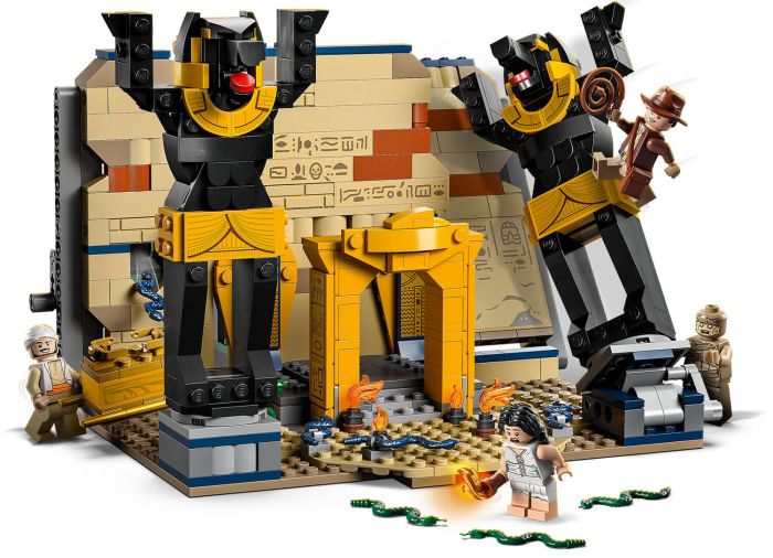 - 4 minifigures – Indiana Jones™ with his famous hat and whip, Marion Ravenwood™, Sallah™, and a mummy. There are also lots of snakes: on the floor and to be pushed through a wall