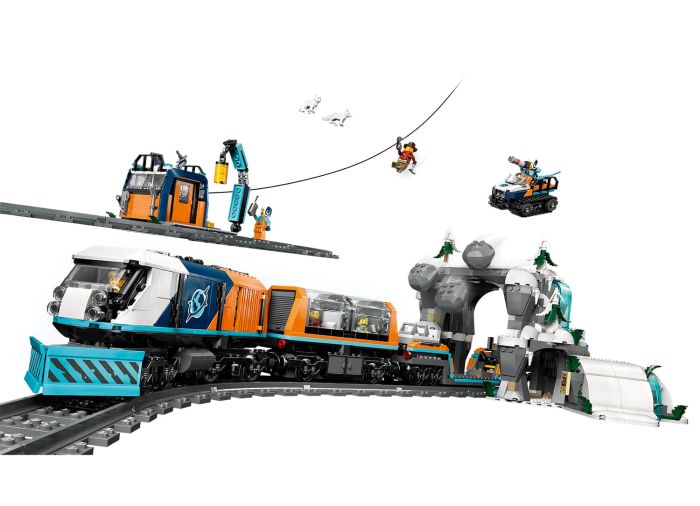 - Features and functions – Kids can drive the toy train through the mountain tunnel to activate a rockfall function and send minifigures down a zip line that connects the mountain to the Arctic outpost