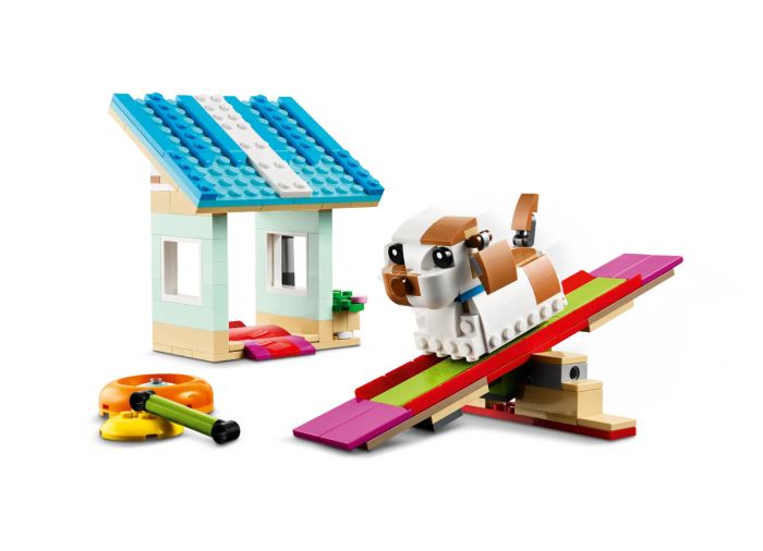 This LEGO® Creator set gives kids 3 different small animal toys to build using the same bricks. They can build a hamster toy playhouse, rebuild it into a play area for a cat with a spinning wheel and a skateboard or a doghouse where a dog can slide down a ramp and play with cool toys.
