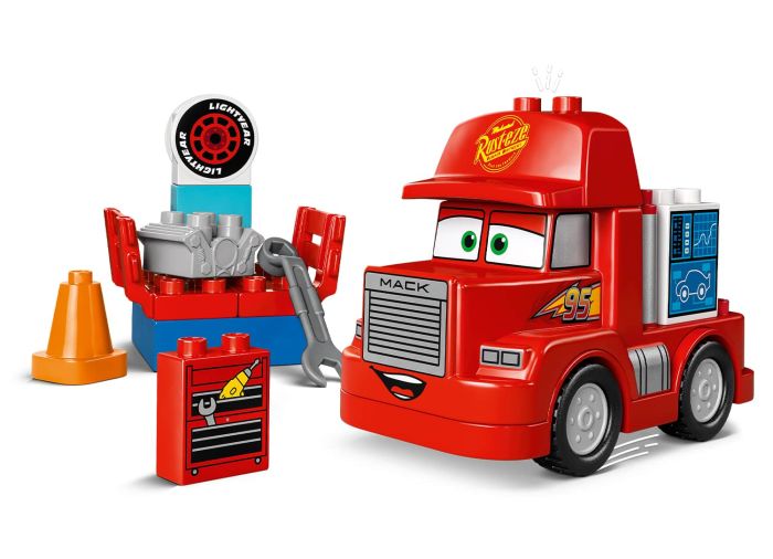- LEGO® DUPLO® truck with creative accessories – Includes a drivable and buildable model of Disney and Pixar’s Mack from the Cars movies, plus a brick-built tuning station, engine brick and a cone