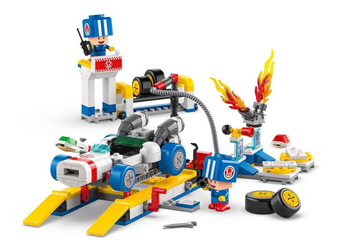 - 2 Nintendo® collectible Blue Toad (Pit Crew) toy figures – This LEGO® brick-built Mario Kart™ set features 2 Blue Toad (Pit Crew) figures in blue pit crew uniform, plus assorted accessories