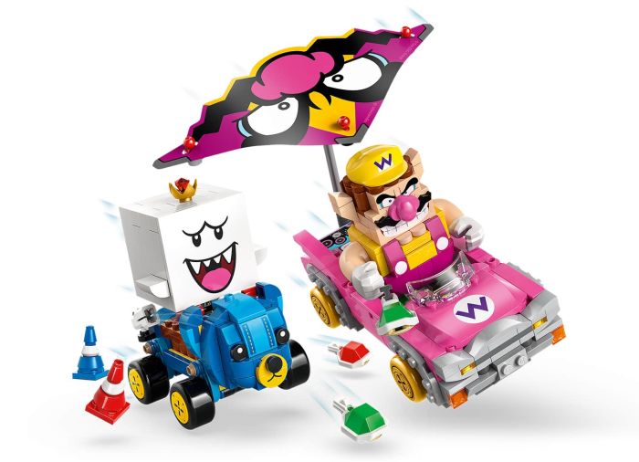 - Brick-built Mario Kart™ toy races – Team up with Wario in the Badwagon and King Boo in the Teddy Buggy for shell-launching battles, drifting and gliding fun and traffic-cone-swerving races