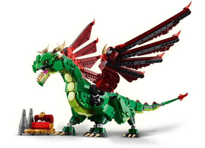 Delight your little time traveler with this LEGO® Creator Medieval Dragon (31161) creature toy playset. Featuring a dragon figure that lets boys and girls aged 9 and up role-play thrilling medieval action, it has a pair of large posable wings that move up and down and fold in and out, as well as posable ankles, toes, neck, jaw, hips and shoulders. It also comes with a treasure chest for added play value.