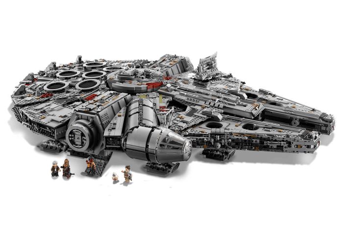 Welcome to the largest, most detailed LEGO® Star Wars Millennium Falcon model we’ve ever created—in fact, with 7,500 pieces it’s one of our biggest LEGO models, period! This amazing LEGO interpretation of Han Solo’s unforgettable Corellian freighter has all the details that Star Wars fans of any age could wish for, including intricate exterior detailing, upper and lower quad laser cannons, landing legs, lowering boarding ramp and a 4-minifigure cockpit with detachable canopy. Remove individual hull plates to reveal the highly detailed main hold, rear compartment and gunnery station. This amazing model also features interchangeable sensor dishes and crew, so you decide whether to play out classic LEGO Star Wars adventures with Han, Leia, Chewbacca and C-3PO, or enter the world of Episode VII and VIII with older Han, Rey, Finn and BB-8!