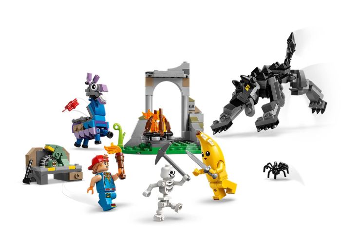 The playset replicates the first challenges players encounter in the LEGO Fortnite Odyssey video game, and boys and girls will have fun building the campfire, a workbench and ruins that can be deconstructed and reconfigured. It also features a Supply Llama figure and a wolf figure with a movable tail and legs. The action is brought to life by minifigures of Peely, Sparkplug and a skeleton, who come with weapon accessories to encourage imaginative role play.
