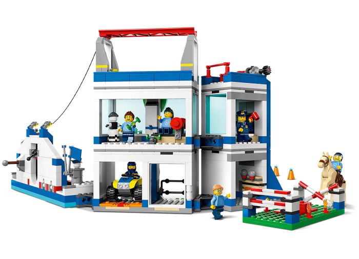 - What’s in the box? – Includes a 2-level police station with lots of outdoor academy training facilities for the LEGO® City police officers, plus a toy quad bike, 6 minifigures and a horse figure
