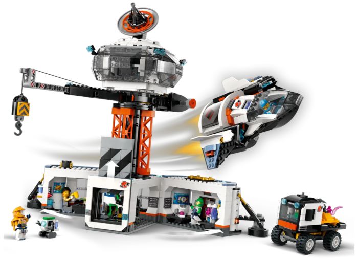 - What’s in this LEGO® City space set? – Everything kids need to build a toy space base with a 360°tower crane, spaceship, launchpad, truck, planet setting, 6 minifigures, a robot and 2 alien figures