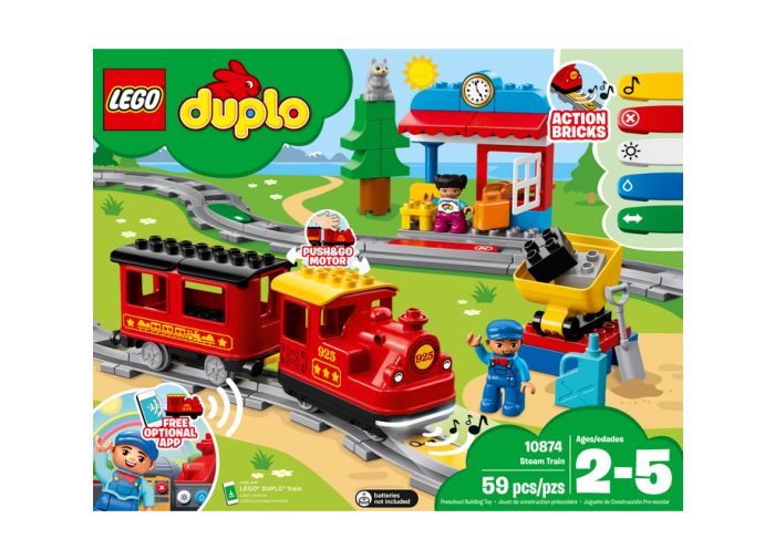 The DUPLO® 10874 Steam Train is now even easier for your toddler to control and interact with in multiple ways. Young children can become the train driver with the Push & Go motor — a gentle push either forwards or backwards sends the train on its way and a firm hold or lift off the tracks will make it stop. Help them place the 5 colored action bricks along the track to sound the horn, turn the lights on and off, pause and refuel, change direction and stop the train wherever they like. With a train station, coal tipper, 2 DUPLO figures plus an animal figure and a simple toy train track included in this LEGO DUPLO set, preschoolers can enjoy classic, fun train play. Download the optional app to unlock even more play possibilities, including remote-control function and fun activities to complete with your toddler!