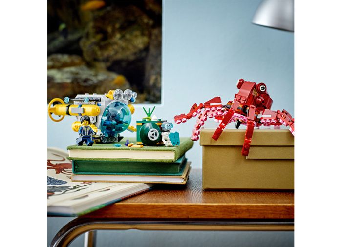 Kids can enjoy 3 different build-and-play experiences with this LEGO Creator 3in1 set. They can build the submarine and octopus toys and then rebuild them into a smaller submarine and giant lobster playset. They can make a scene with a giant manta ray, a diver and a coral reef with a small cave, or use their imaginations and turn the same bricks into something else.