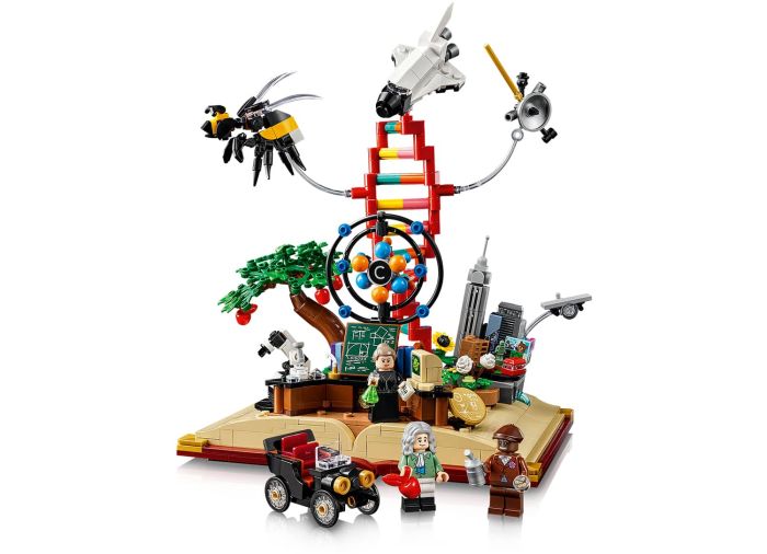 - Collectible display model for adults – A buildable base shaped like an open book is topped with many mini builds including Newton’s apple tree, Carver’s plants bed, a space shuttle and a robotic arm
