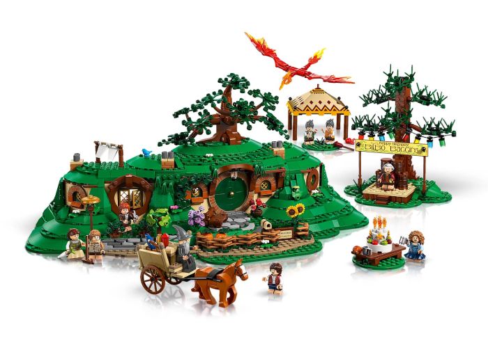 - Packed with movie-themed details – Includes Gandalf’s horse and cart, fireworks, a firework dragon figure, the Party Tree, party pavilion and Bilbo’s book, which can be displayed open or closed