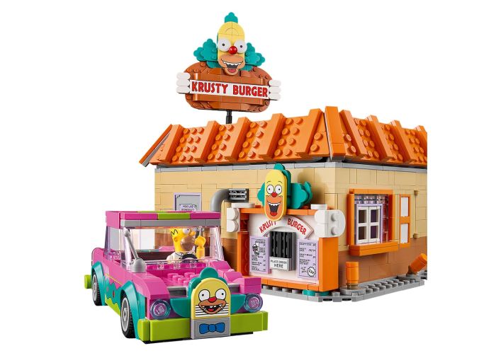 - What’s in the box – The Simpsons™: Krusty Burger restaurant, pole sign, Homer’s clown car and Homer, Bart and Lisa Simpson, Farmer Krusty, Sideshow Bob, Squeaky Voiced Teen and Officer Lou minifigures