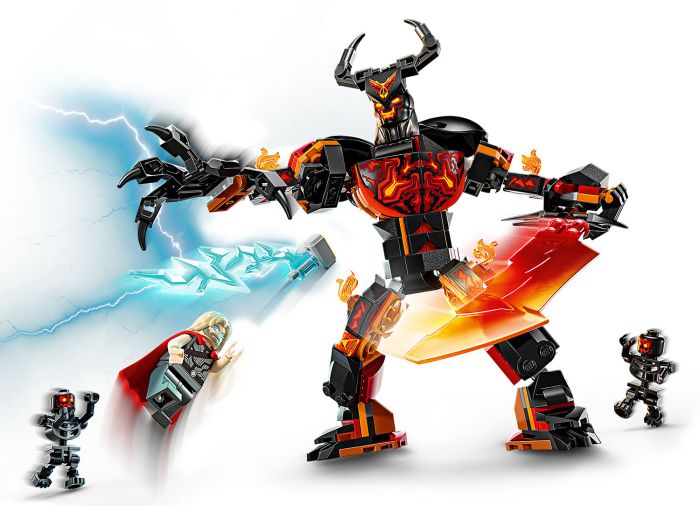 - The Avengers: Thor vs. Surtur buildable toy for kids – The Super Hero minifigure battles a giant, buildable figure with a flaming sword in this LEGO® Marvel playset for boys and girls aged 8 and up