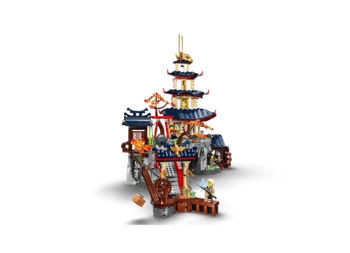 The NINJAGO temple built into a rock face features a 4-tiered pagoda, a bridge, a water mill kids can turn to move 2 battle platforms anda blacksmith’s hammer, plus falling rocks that are activated by pressing a lantern, hidden storage and a secret door. Kids can turn the temple around, where its open back provides extra play options and the chance to create fun little stories.