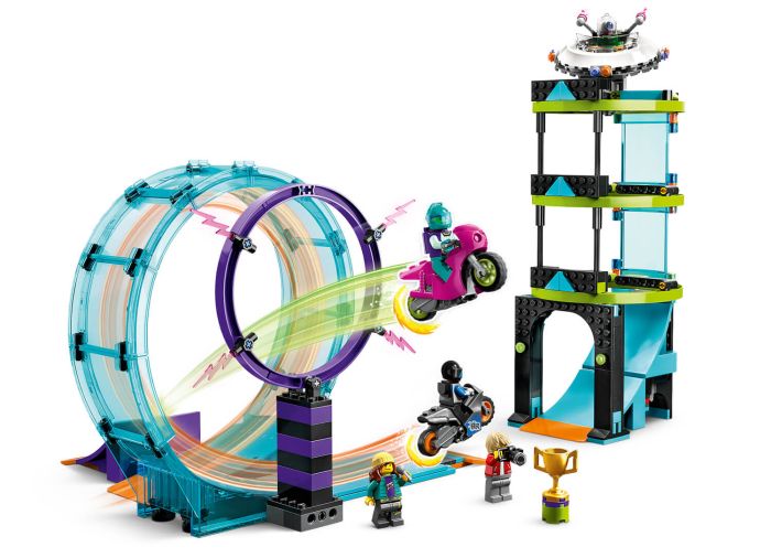 - What’s in the box? – Stunt challenges in this toy playset include a 360° loop, ring of fire and an ‘alien tower’ vertical climb, plus a jump ramp, 2 toy stunt motorcycles and 2 rider minifigures