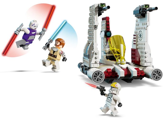The buildable vehicle playset features 3 LEGO Star Wars minifigures, including Asajj Ventress with 2 red Lightsabers™ with special curved hilts and General Obi-Wan Kenobi with a blue Lightsaber™ for action-packed duels.