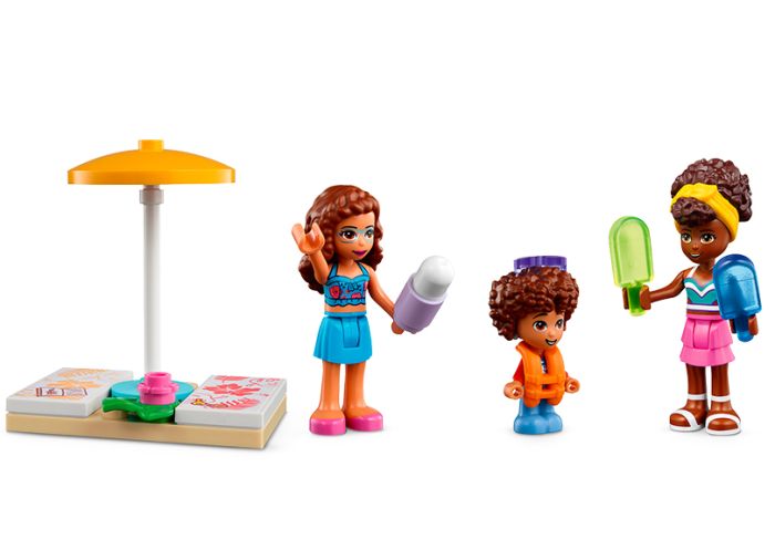 There are lots of realistic features to explore, including 2 slides, a spraying octopus, waterfall shower and a grotto with an aquarium. Away from the splash action is a cute changing area complete with a shower and restroom. LEGO Friends Olivia, Santiago and Nandi can cool down with a treat from the popsicle stand and relax under the sunshades.